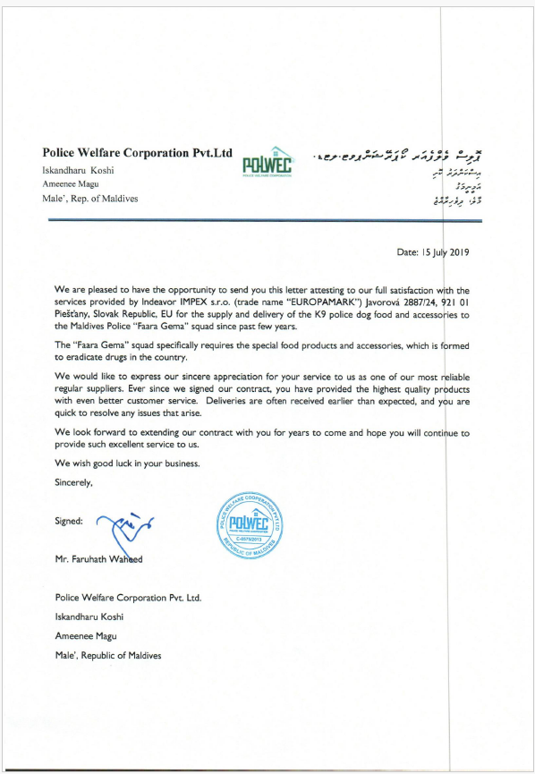 EUROPAMARK is honored to be the trusted supplier to the esteemed "Faara Gema" K9 Dog Squad of the Maldives Police, a partnership that has flourished over the years. The "Faara Gema" squad, was once faced with the challenge of finding a reliable and serious supplier. Since then, we are proud to say that they have become one of our satisfied customers, thanks to our dedicated and professional team. The K9 squad, formed to combat drug-related issues in the country, requires specific food products for their canine team. EUROPAMARK has been successfully fulfilling these specialized needs for many years, proving to be the serious and dependable partner they were searching for. We remain committed to supporting our clients with the highest quality products and services. EUROPAMARK – Your Reliable Supplier, Your Satisfaction is Our Goal.